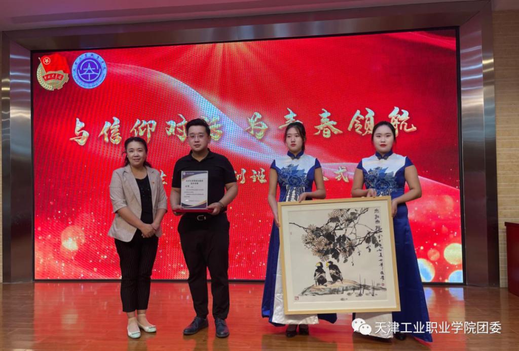 學院黨委書記汪坪為張耀老師頒發校外思政導師聘書,張耀老師為學院贈送畫作。