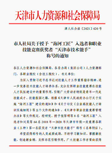 近日,天津市人社局授予2018年-2020年天津市市級一類競賽各職業(工種)第一名獲獎者“天津市技術能手”稱號。我院機械工程系謝金濤、李連亮、戴冬晨三名老師以2019年天津市智能制造應用技術技能大賽暨第三屆全國智能制造應用技術技能大賽天津選拔賽第一名的成績獲此稱號。