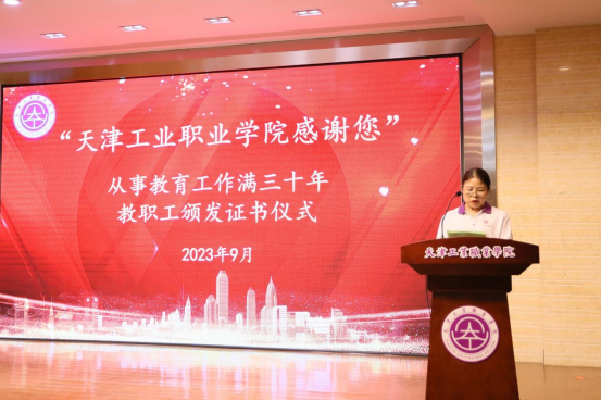 又是一載流光溢彩,又是一季桃李芬芳。2023年學院又有十名教職工從事教育工作滿三十年,這里面有辛苦耕耘、培育桃李的教學、科研人員;也有全心全意服務師生的管理人員。他們為學院的發展,為學生的成才貢獻了力量,奉獻了青春年華。大會舉行“天津工業職業學院感謝您”學院2023年從事教育工作滿三十人員頒發證書儀式。由學院黨委教師工作部(人力資源部)鄧昊部長,介紹10名教職工簡要事跡。學院領導在主會場、天鐵校區教學部的教師代表在分會場分別為從教三十年教職工頒發了榮譽證書。質量監測和評估辦公室教學督導楊祝英老師代表10名從教滿三十年教職工發言。