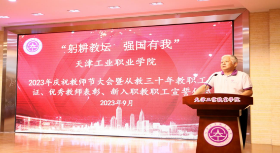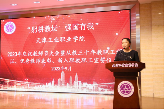 9月12日下午,“躬耕教壇 強國有我”2023年天津工業職業學院慶祝教師節大會暨從教三十年教師頒證、優秀教師表彰、新入職教職工宣誓儀式在學院六角報告廳舉行。學院領導班子成員、全體教職員工參加大會,學院黨委副書記柴娜娜主持會議。