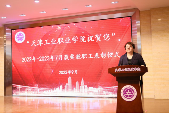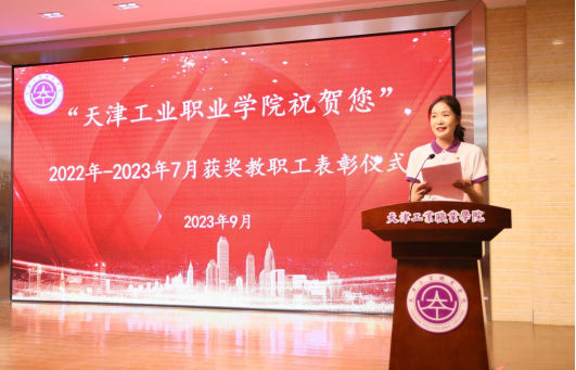 學院基于“國家新形勢、地區新發展、行業新背景、學院新任務”給予的機遇與挑戰。近幾年學院辦學實力進一步提升、教學水平不斷提高,這得力于學院全體教職工工作的付出。大會舉行“天津工業職業學院祝賀您”學院獲獎教職工表彰儀式,黨委副書記柴娜娜宣讀本年度獲得省部級及以上獎勵教師73人表彰決定,學院領導為教師們頒發了獲獎證書。2023年天津市思政課教師“拿手一課”交流活動展示特等獎獲獎者—學院思政課部盧婉婷老師代表73名獲獎教師發言。
