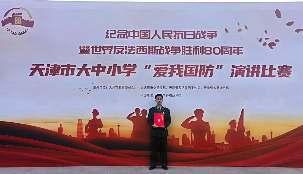 5月29日,在天津市教育委員會、中共天津市委宣傳部、天津警備區政治工作局、天津警備區動員局聯合主辦的紀念中國人民抗日戰爭暨世界反法西斯戰爭勝利80周年天津市大中小學“愛我國防”演講比賽決賽中,由黨委學生工作部(學生管理部)選拔、指導的退役大學生士兵柳澤域榮獲大賽三等獎。